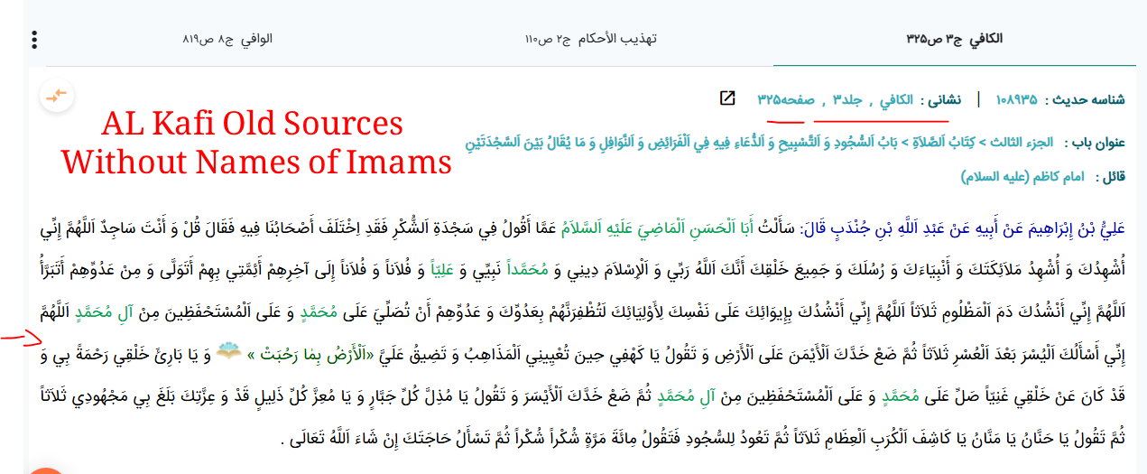 - الفقیہ میں دعا: الصدوق نے “الفقیہ” میں سجدہ شکر کے دوران موسیٰ بن جعفر سے ایک دعا نقل کی ہے جس میں تمام اماموں کے نام مذکور ہیں۔ یہی روایت “الکافی” 3/325 میں اماموں کے ناموں کے بغیر ملتی ہے۔ ایک بار پھر، ہم ایک رجحان دیکھ رہے ہیں۔ بعد کی کتابیں ان احادیث میں اماموں کے نام زبردستی شامل کرتی ہیں جو پہلے اماموں کے ناموں کے بغیر گردش میں تھیں۔