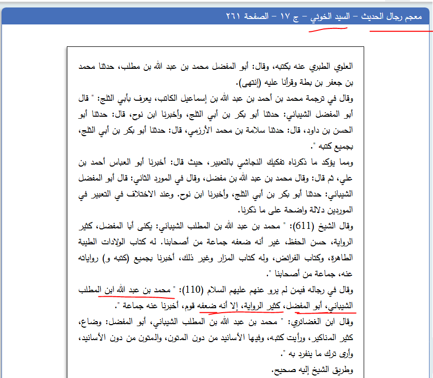 معجم رجال الحديث میں سید ابوالقاسم الخوئی نے محمد بن عبد الله الشيباني أبو المفضل کے بارے میں لکھا ہے کہ وہ حدیث گھڑنے والا (وضّاع) تھا اور ضعیف ہے۔ ساتھ ہی یہ بھی ذکر کیا کہ وہ اکثر منقطع روایات بھی بیان کرتا تھا، یعنی ایسی روایات جن کی سند مکمل طور پر متصل نہ ہو