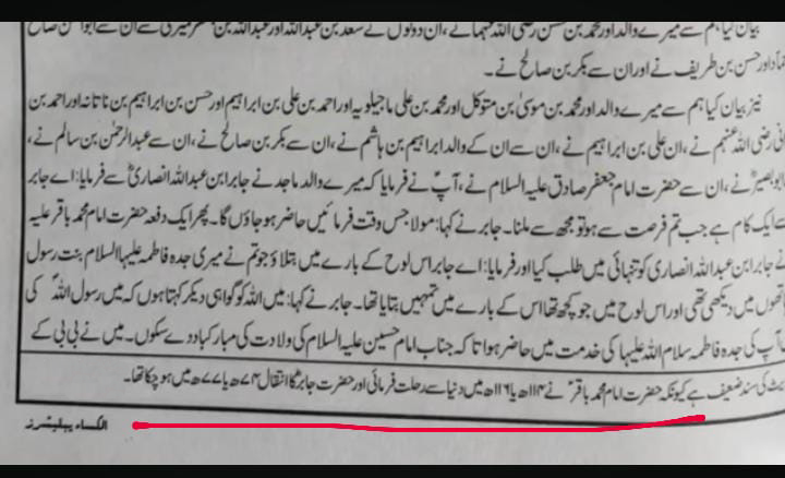اسی طرح اس حدیث کے آخر میں فٹ نوٹ پر شیخ صدوق کی کتاب کمال الدین و تمام النعمة میں لکھا گیا ہے کہ یہ حدیث لوحِ فاطمہ سلام اللہ علیہا والی ضعیف ہے کیونکہ امام باقر علیہ السلام نے 114 یا 116 ہجری میں اس دنیا سے رحلت فرمائی اور جابر بن عبداللہ الانصاری کا انتقال 77 ہجری میں ہو چکا تھا۔ اس وجہ سے آپ نے امام صادق علیہ السلام کا زمانہ نہیں پایا۔