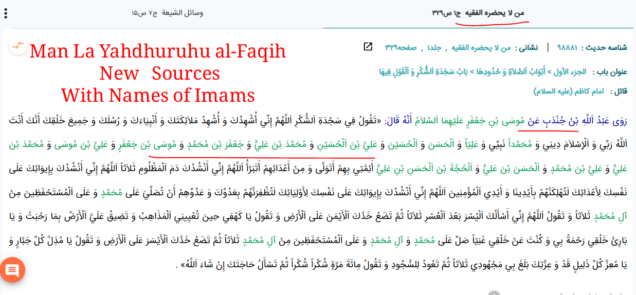 - الفقیہ میں دعا: الصدوق نے “الفقیہ” میں سجدہ شکر کے دوران موسیٰ بن جعفر سے ایک دعا نقل کی ہے جس میں تمام اماموں کے نام مذکور ہیں۔ یہی روایت “الکافی” 3/325 میں اماموں کے ناموں کے بغیر ملتی ہے۔ ایک بار پھر، ہم ایک رجحان دیکھ رہے ہیں۔ بعد کی کتابیں ان احادیث میں اماموں کے نام زبردستی شامل کرتی ہیں جو پہلے اماموں کے ناموں کے بغیر گردش میں تھیں۔